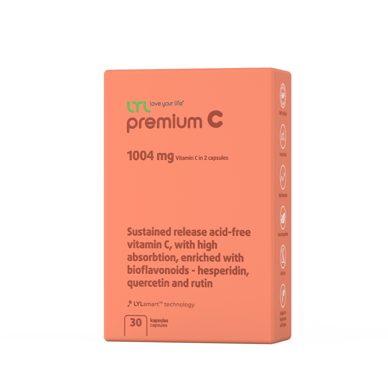 Happevaba C -vitamiin, rikastatud väärtuslike bioflavonoididega - hesperidiin, kvertsetiin ja rutiin.